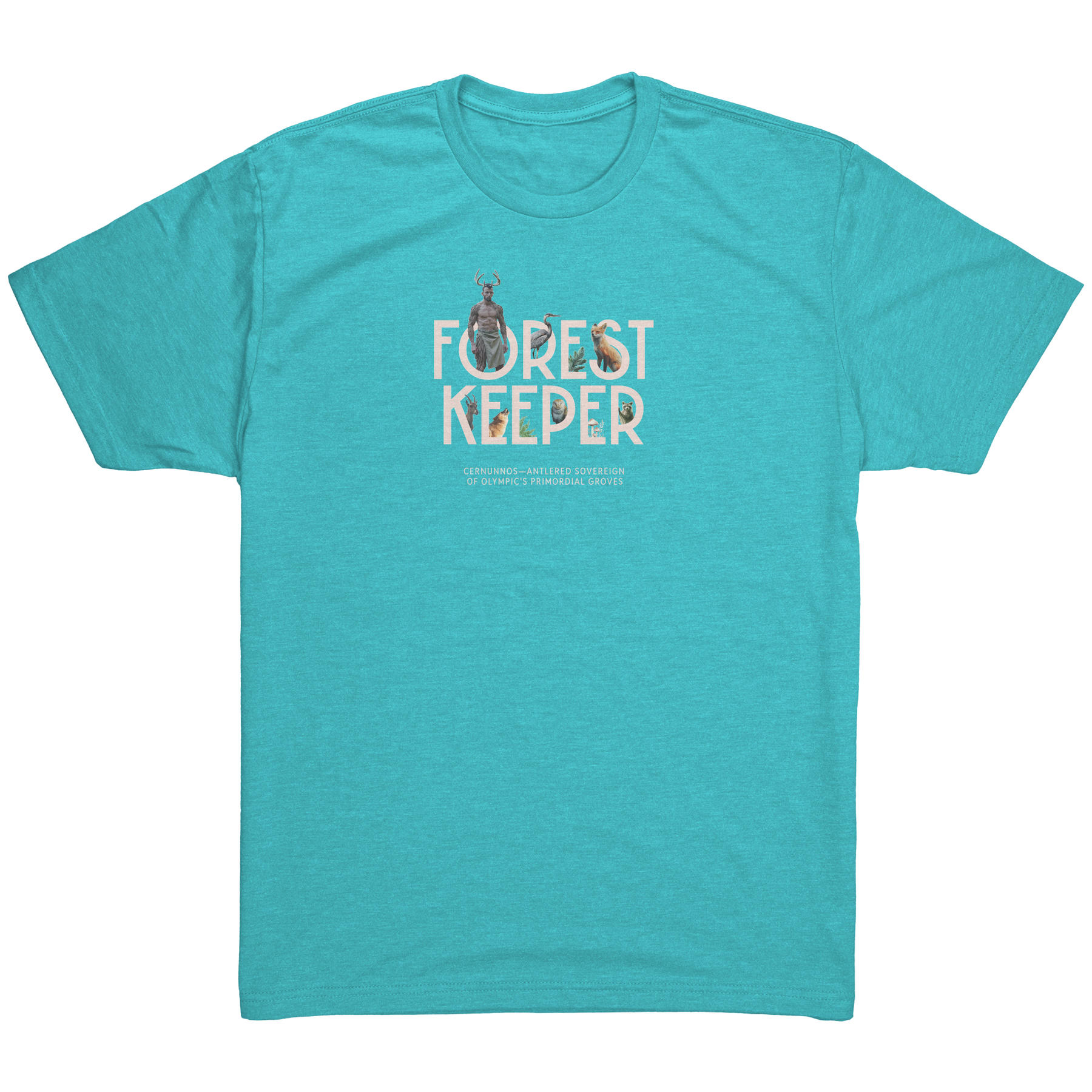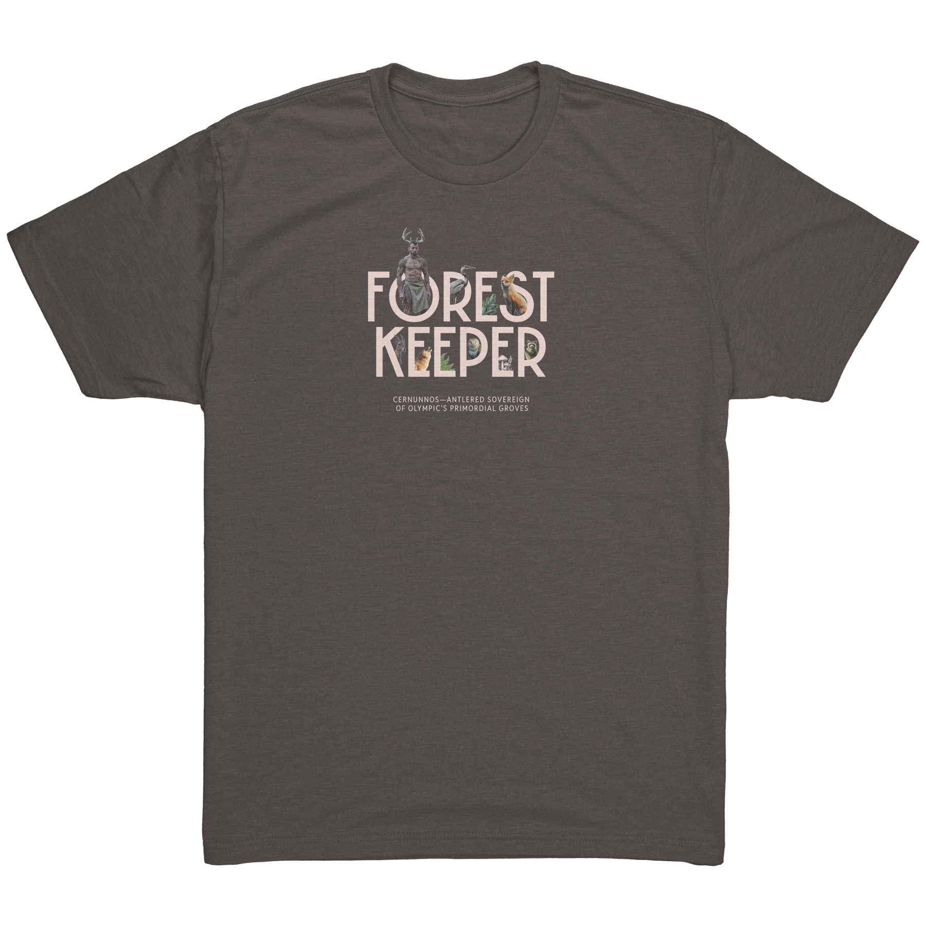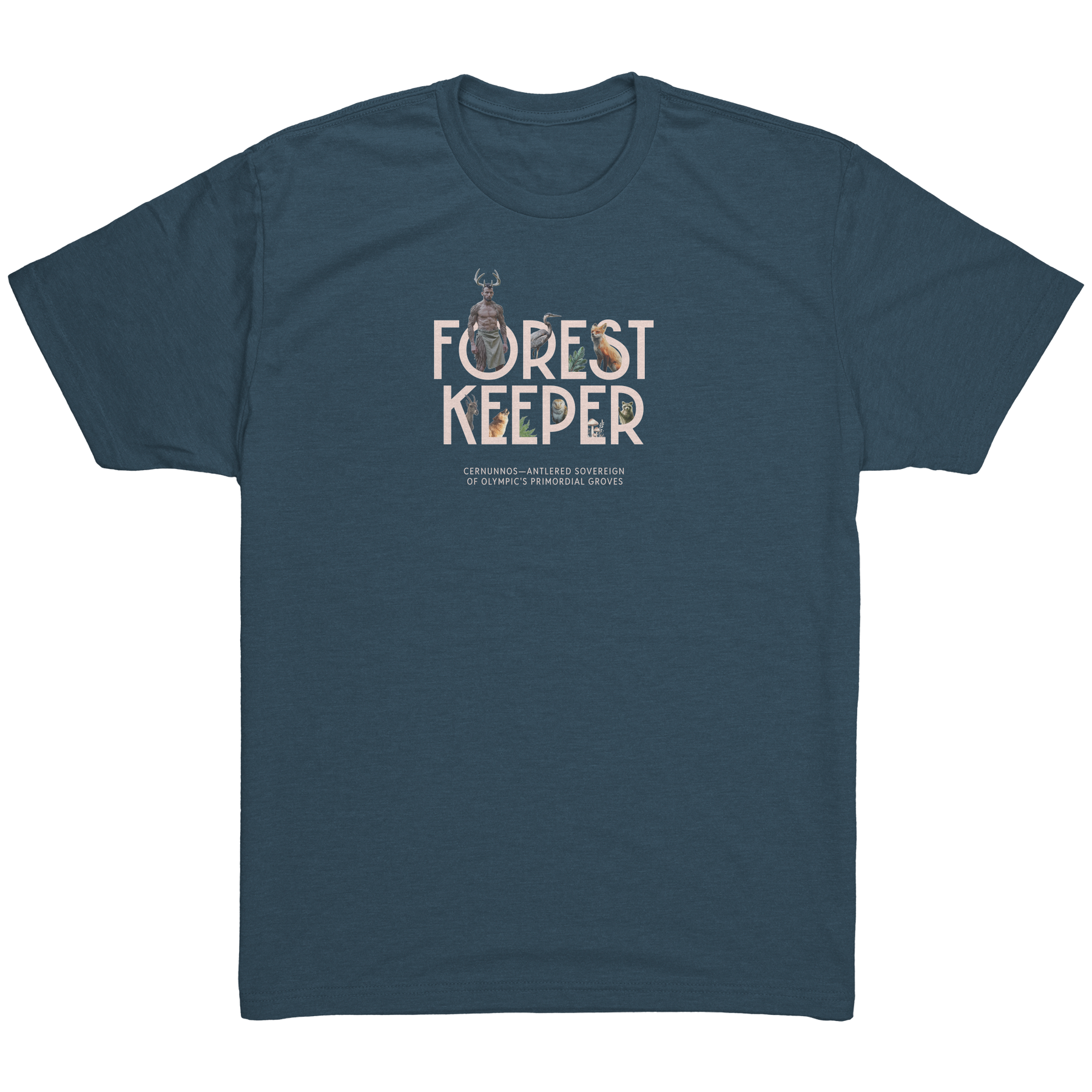 The Olympic Peninsula needs all its guardians - from park rangers in their wide-brimmed hats to the antlered sovereign watching from the trees. Here, Cernunnos emerges from the "O" in "Forest Keeper," his ancient gaze meeting ours across centuries of stewardship. This tee honors both the seen and unseen protectors of these woods.