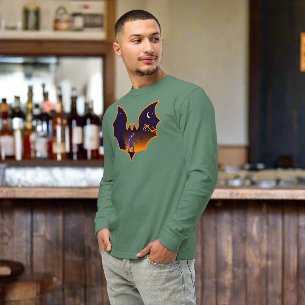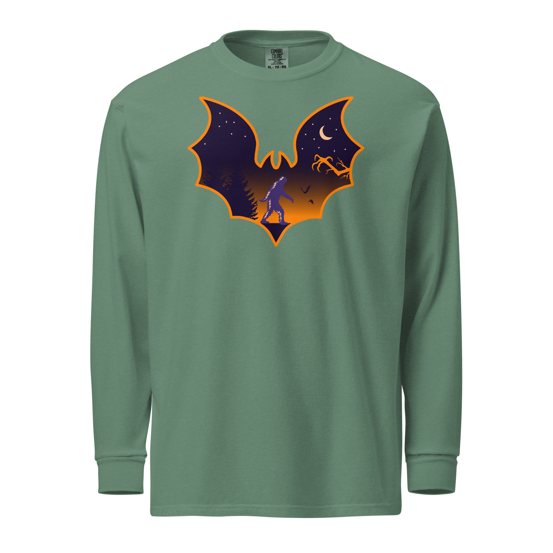 Bigfoot on the Olympic Peninsula isn’t just a myth—he's a shadow in the woods, a fleeting shape against the twilight sky. This long-sleeve tee is for men who are "batty" for the mystery, for the creatures that live just beyond the treeline. The design captures a shadowy Sasquatch silhouette within a striking bat-wing shape, a perfect blend of woodland mystery and nighttime lore. Crafted from a durable, heavyweight 6.1 oz. ring-spun cotton, this tee is garment-dyed for a lived-in feel and a color that holds up through countless washes. It’s got a relaxed fit, a classic collar, and reinforced seams, making it as reliable as a compass and as comfortable as a broken-in boot.