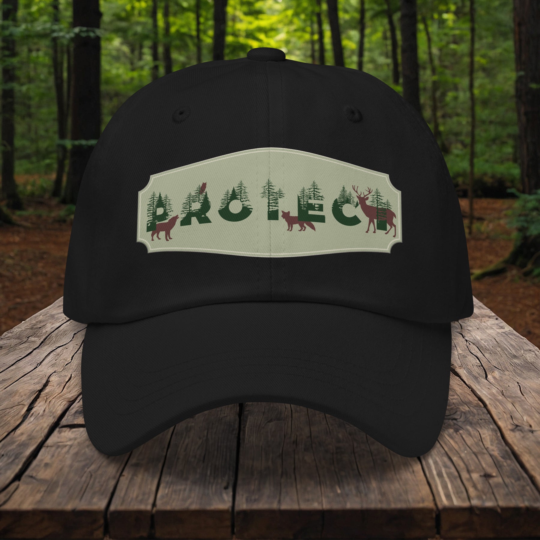 The Olympic Peninsula demands respect, and its guardians deserve gear that honors the quiet pact between man and wild. This low-profile dad hat features the word "PROTECT" : the letters are filled with forest green Olympic firs, shadowed by the silhouettes of the region's ancient denizens—wolf, fox, owl, and deer.