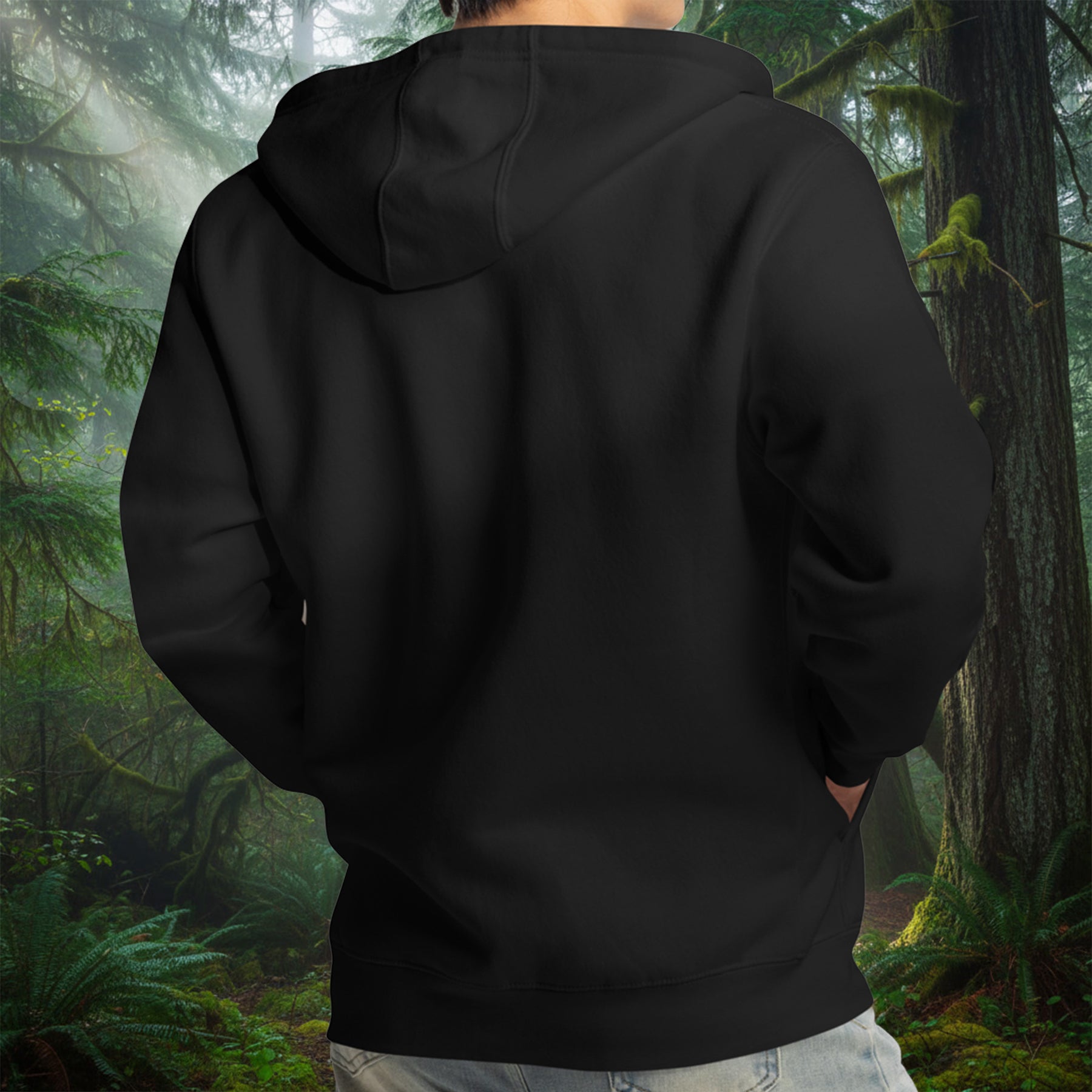The Olympic Peninsula is home to the ultimate lore: the Sasquatch. This zip hoodie honors the unseen guardian of the deep woods with a subtle Sasquatch silhouette set against a backdrop of dense firs, placed on the left chest—the perfect marker for the trail tracker in you.