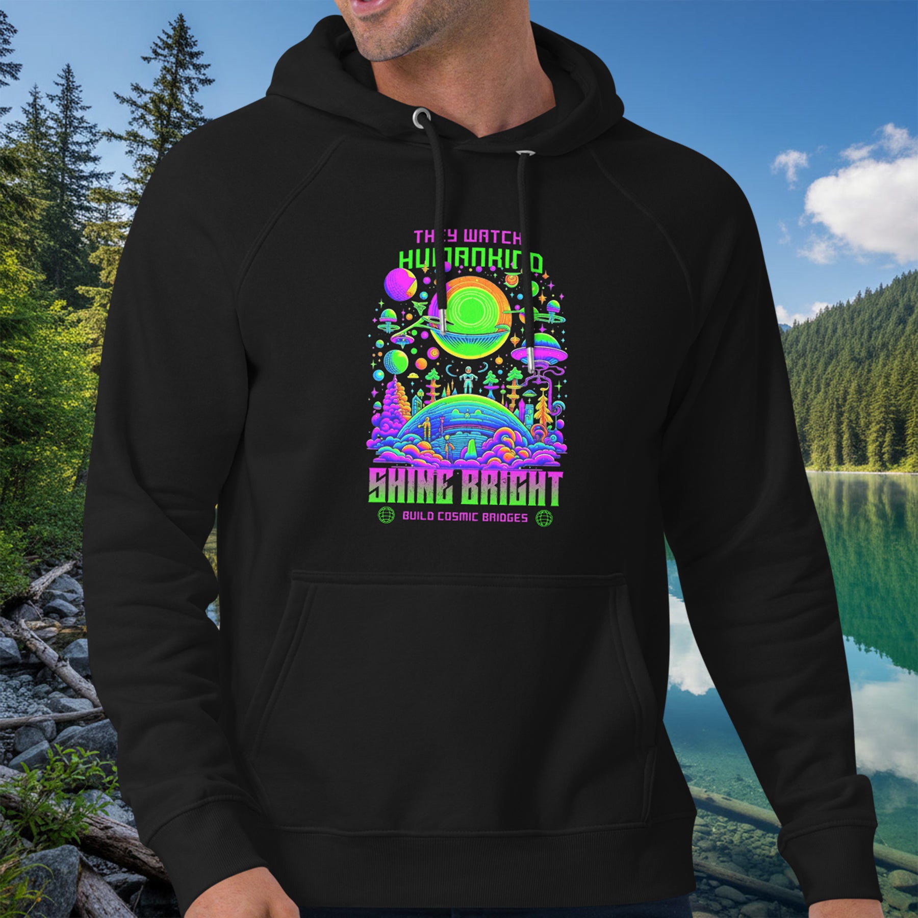 Let your flag fly with the Shine Bright Hoodie, featuring an otherworldly "They Watch Humankind" alien design. This eco raglan hoodie is a perfect blend of comfort and style, designed to keep you cozy while making a statement.