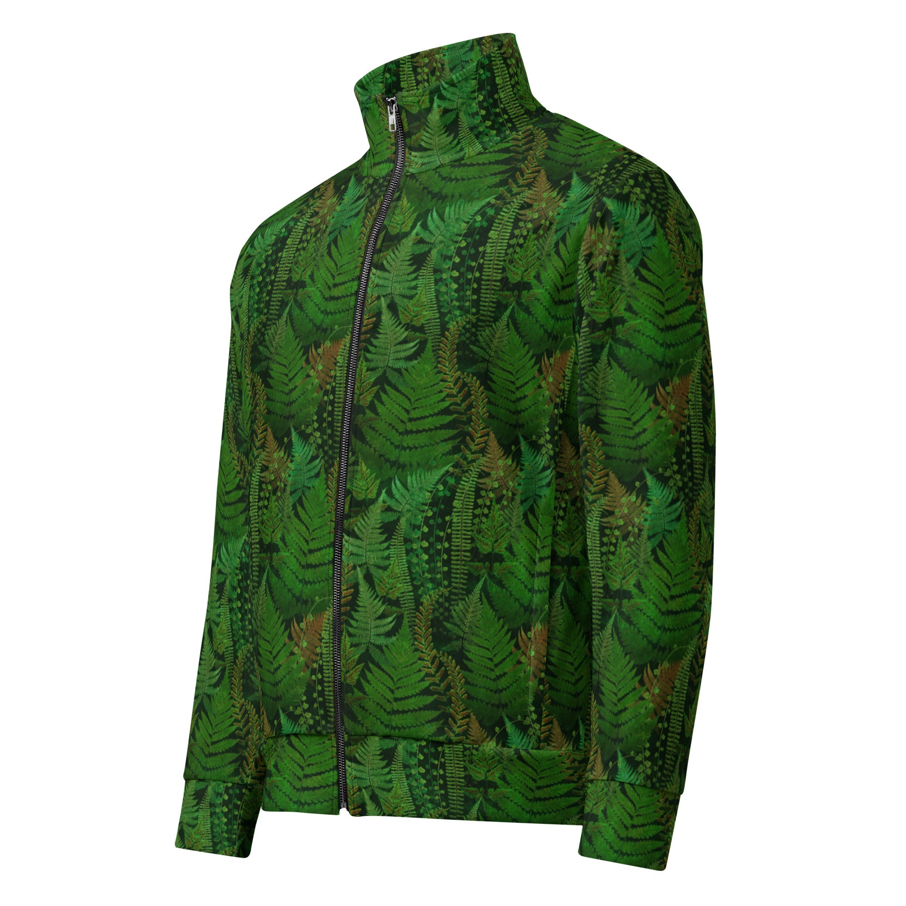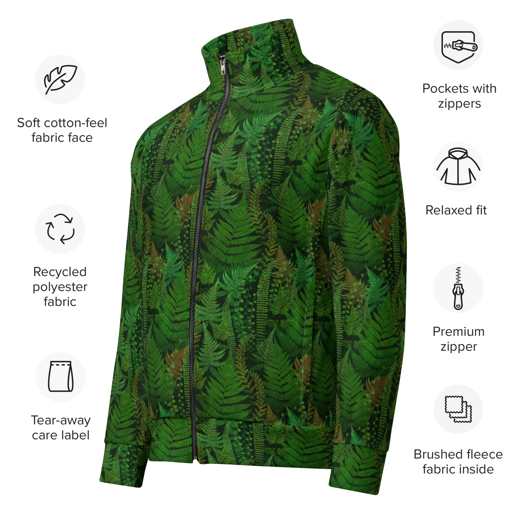 The Olympic Peninsula's heart is a vibrant tapestry of green, and this zip-up track jacket wears that pattern with pride. A subtle yet striking green fern design covers this jacket, inviting you to blend in with the wilderness while standing out from the crowd. Made from a durable and eco-conscious blend of 95% recycled polyester and 5% spandex, this jacket is not just a piece of gear—it’s a commitment to the earth. The brushed fleece interior provides cozy warmth for misty mornings or cool evenings, while the soft, cotton-feel fabric face feels great on the skin. With a relaxed unisex fit and zippered pockets for your essentials, this jacket is certified under GRS (Global Recycled Standard), making it the perfect choice for men who demand both style and sustainability on their adventures.