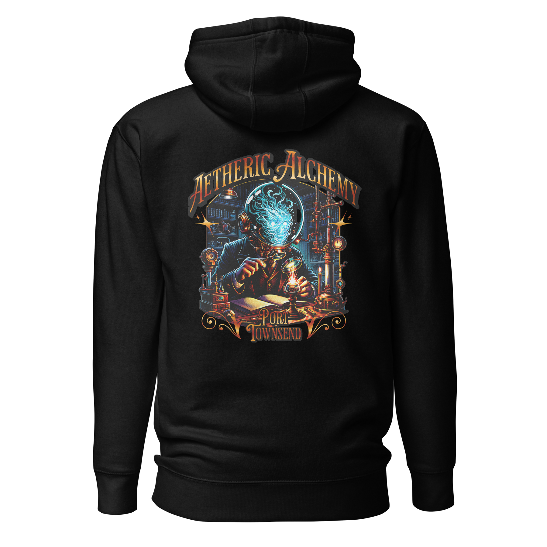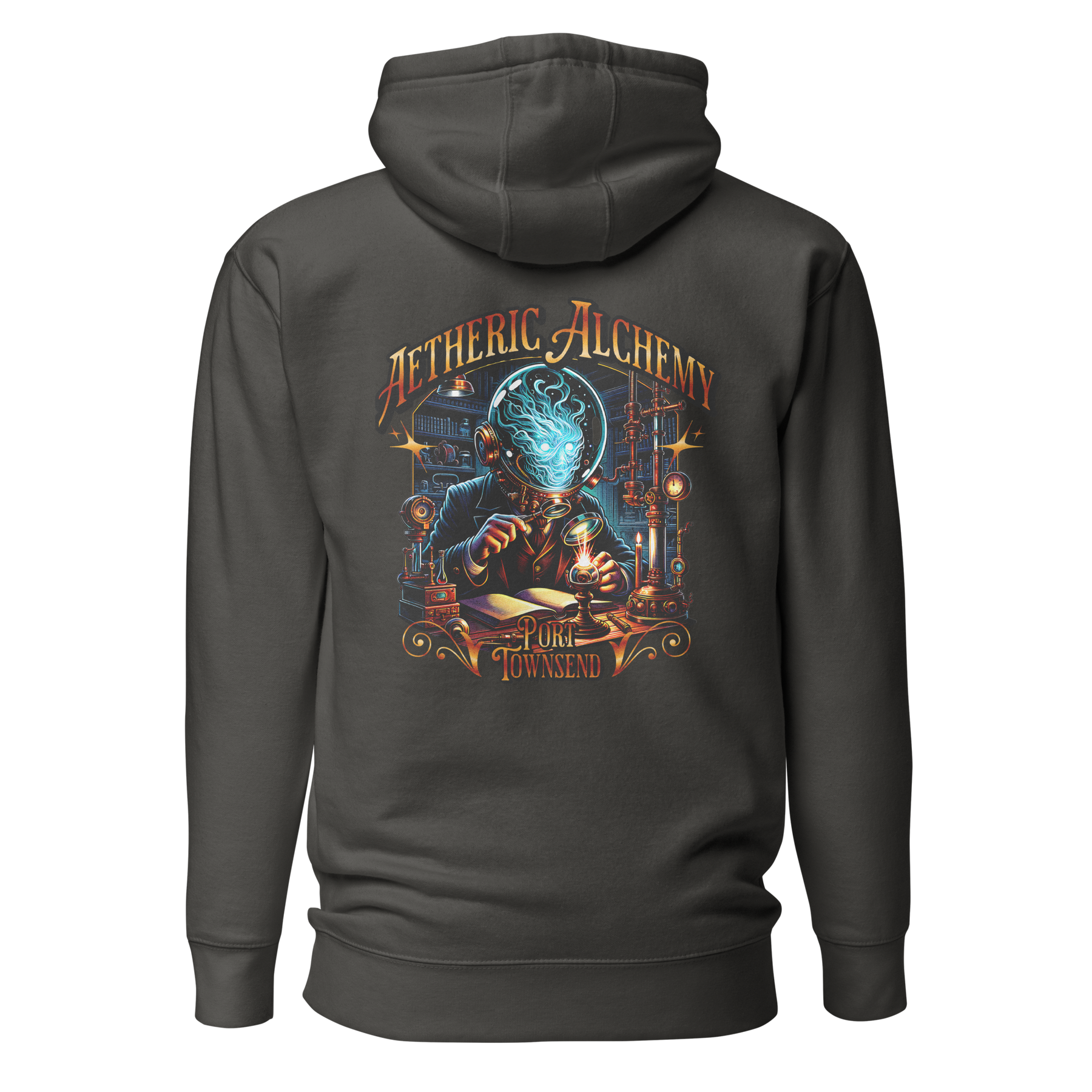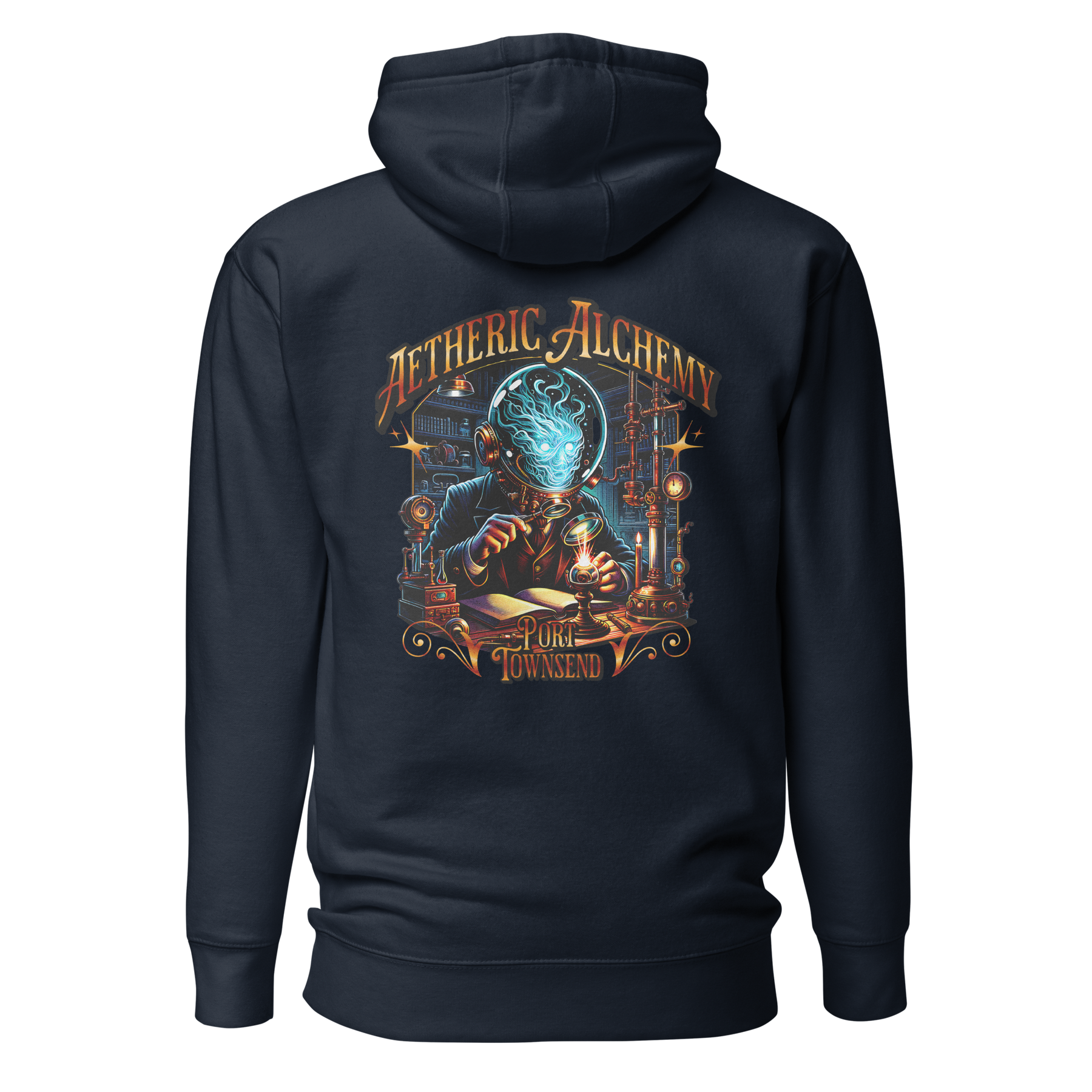 Port Townsend isn't just a place; it's a feeling—a crossroads of old-world Victorian charm and the mysteries that drift in with the fog. This hoodie is a tribute to the unseen sciences and the curious minds that once roamed its streets. The design, Aetheric Alchemy, depicts a man exploring a forgotten science, a visual nod to the hidden wonders of the Olympic Peninsula. Made from a cotton-rich blend with a 100% cotton face, this classic streetwear piece is as comfortable as it is intriguing. With its front pouch pocket and a warm 3-panel hood, it's the perfect choice for a chilly evening stroll through Port Townsend's historic waterfront or a late night of deep thinking.