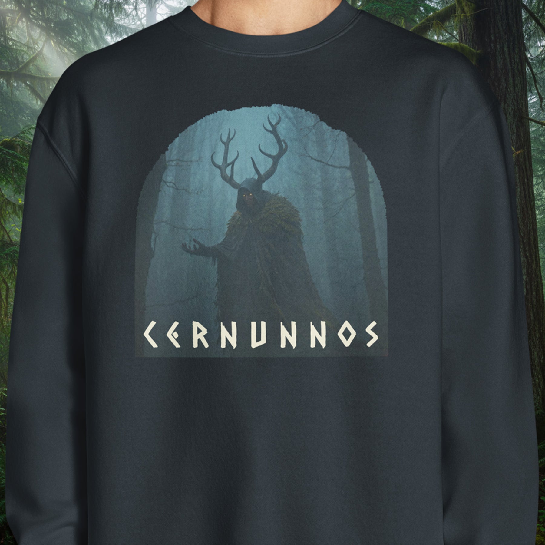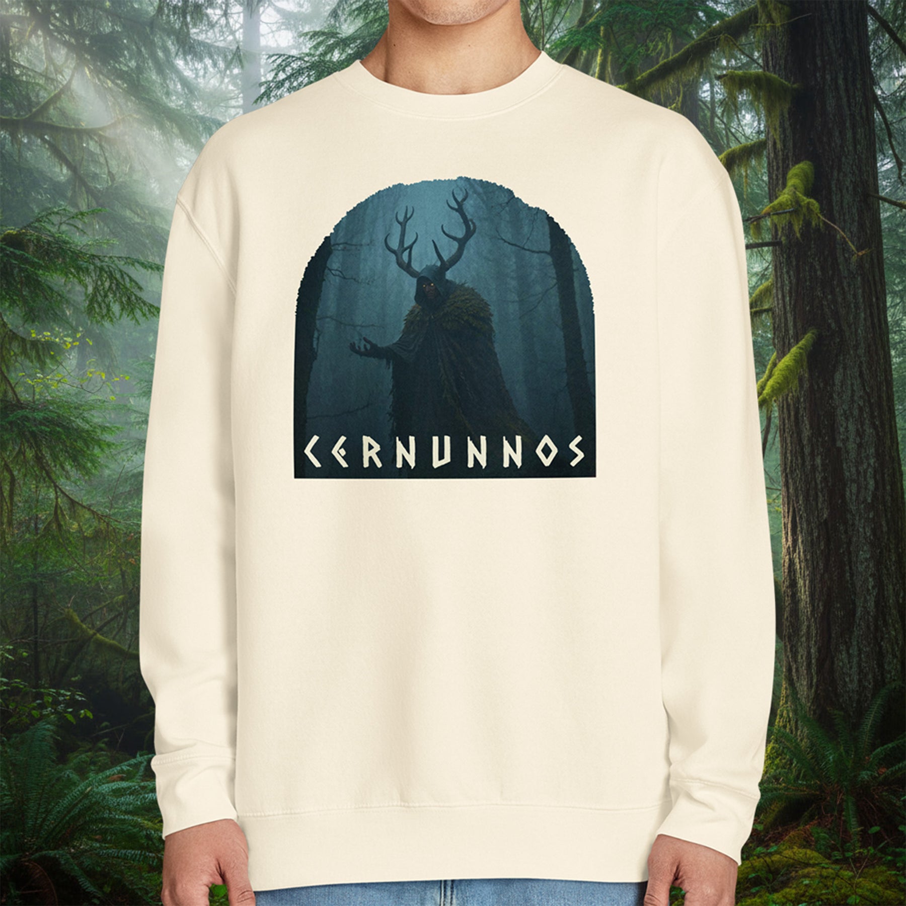 In the mist-choked depths of the Olympic Peninsula's ancient forests, where the rain never quite stops and the trees remember things men have forgotten, he still walks. Antlers crown a hooded silhouette, eyes burning low and steady beneath the cloak, moss and shadow clinging to broad shoulders like old allies. This crewneck carries that presence: the horned figure emerging from fog-veiled evergreens, rendered in cold blues and deep greens, with rough rune-like lettering spelling his name across the lower edge. Cut from heavy cotton-rich fleece with a soft brushed interior and 100% cotton face, it delivers lasting warmth on damp trails or quiet nights by the strait. Double-needle seams and ribbed cuffs hold firm through hard seasons, while minimal shrinkage keeps the fit true. Pull it on when the woods feel watchful and the old powers stir just beyond the firelight.