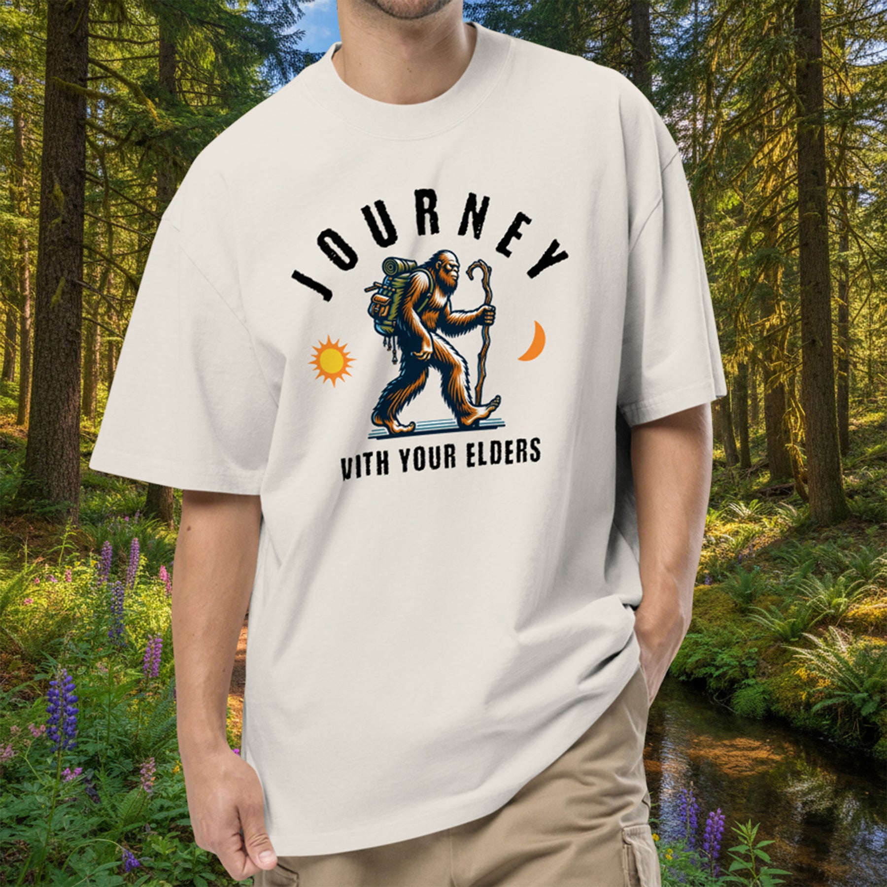 There are footprints in the Olympic mud that predate our maps. The Ancient Nomad tee features the "Journey with Your Elders" graphic, a tribute to the massive, elusive wanderers who have traversed these ridgelines long before us. This shirt is for the man who moves with the weight of the woods on his shoulders and the patience of the hemlocks in his stride.
